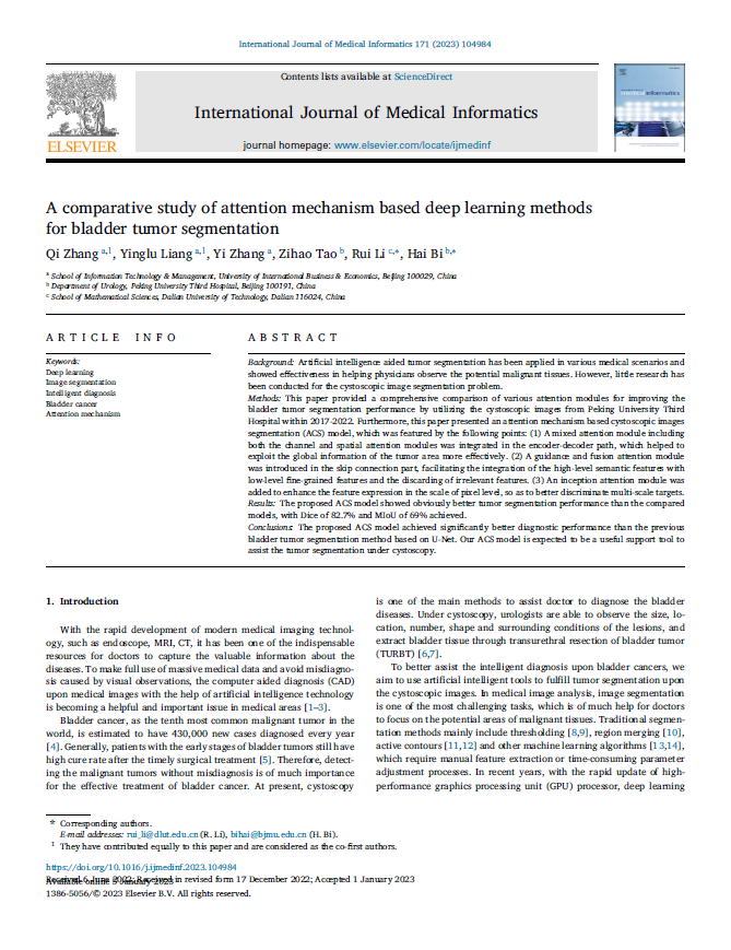 Qi Zhang, Yinglu Liang, Yi Zhang, Zihao Tao, Rui Li, and Hai Bi, “A comparative study of attention mechanism based deep learning methods for bladder tumor segmentation”, International Journal of Medical Informatics, vol, 171, p. 104984, 2023.