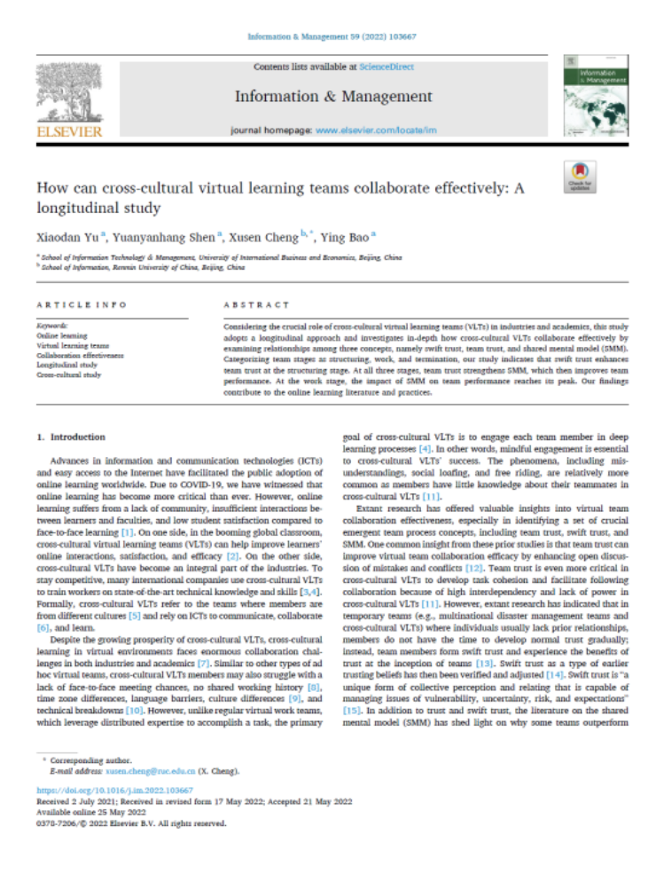 Yu, X., Shen, Y., Cheng, X., & Bao, Y. (2022). How can cross-cultural virtual learning teams collaborate effectively: A longitudinal study. Information & Management, 59(6), 103667.