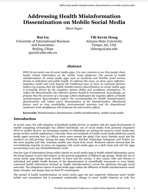 论文信息:Gu, R., and Hong, Y. K. 2019. "Addressing Health Misinformation Dissemination on Mobile Social Media," in Proceedings of the 40th International Conference on Information Systems (ICIS 2019), Munich, Germany: AIS, pp. 1-9.