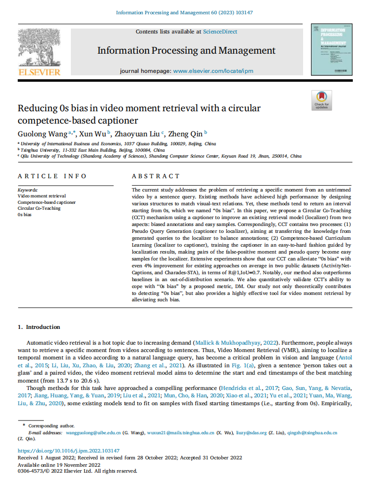 Wang, G., Wu, X., Liu, Z., & Qin, Z. (2023). Reducing 0s bias in video moment retrieval with a circular competence-based captioner. Information Processing & Management, 60(2), 103147. 国际B类期刊