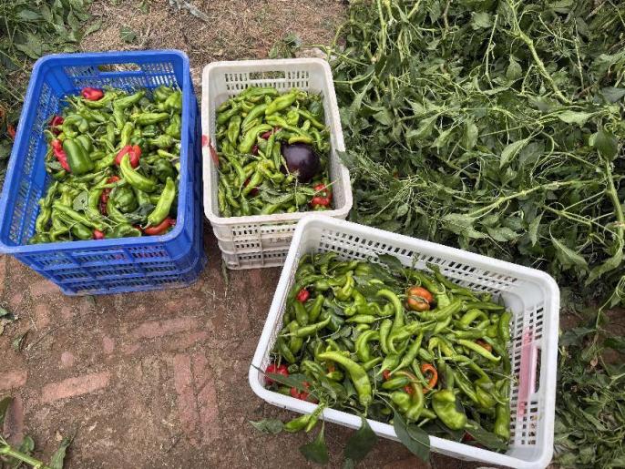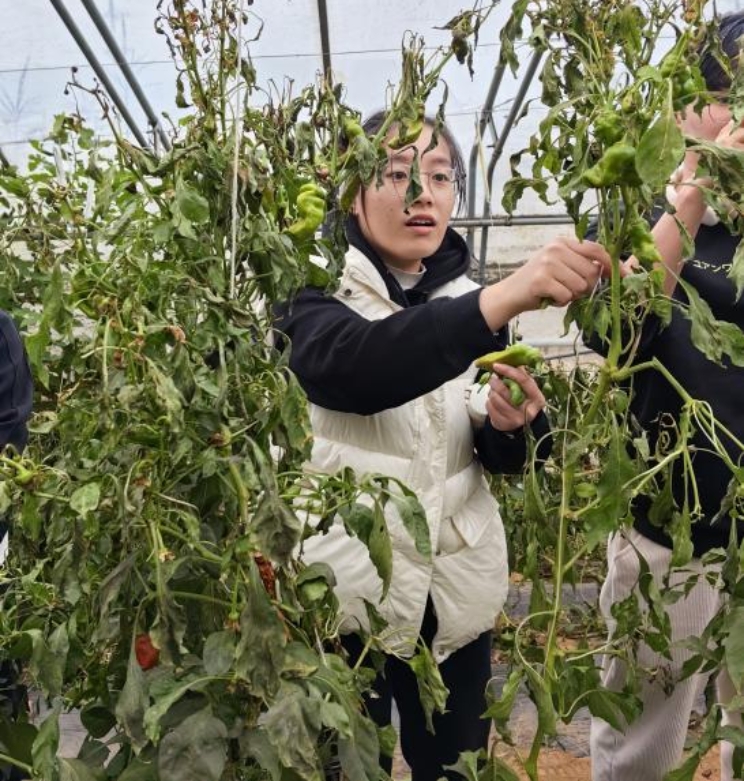 活动首站,同学们在工作人员的指导下开启辣椒采摘实践。工作人员从辣椒品种特性到采摘手法逐一讲解。随后,同学们以小组为单位分工协作,采摘成熟果实、整理装筐、清运残枝。经过高效劳作,几大筐红绿相间的辣椒整齐码放,展示着丰硕的成果。